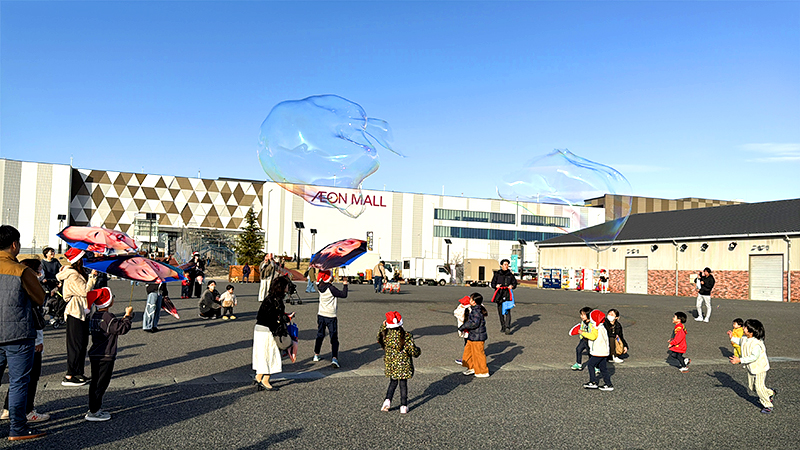 アクアマリンふくしまの前にある芝生前広場に来ると、なんとシャボン玉が飛んできて、子どもたちは大はしゃぎ!