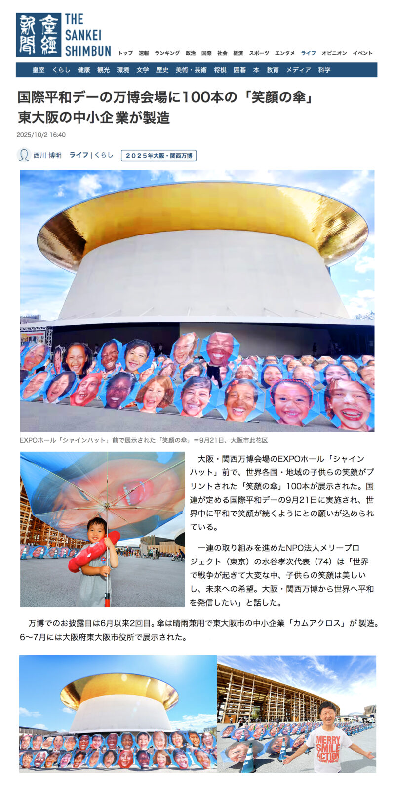 産經新聞「国際平和デーの万博会場に100本の「笑顔の傘」 東大阪の中小企業が製造」