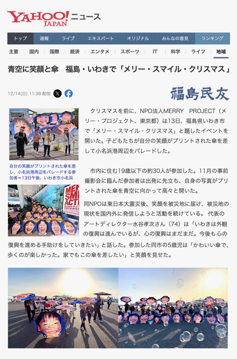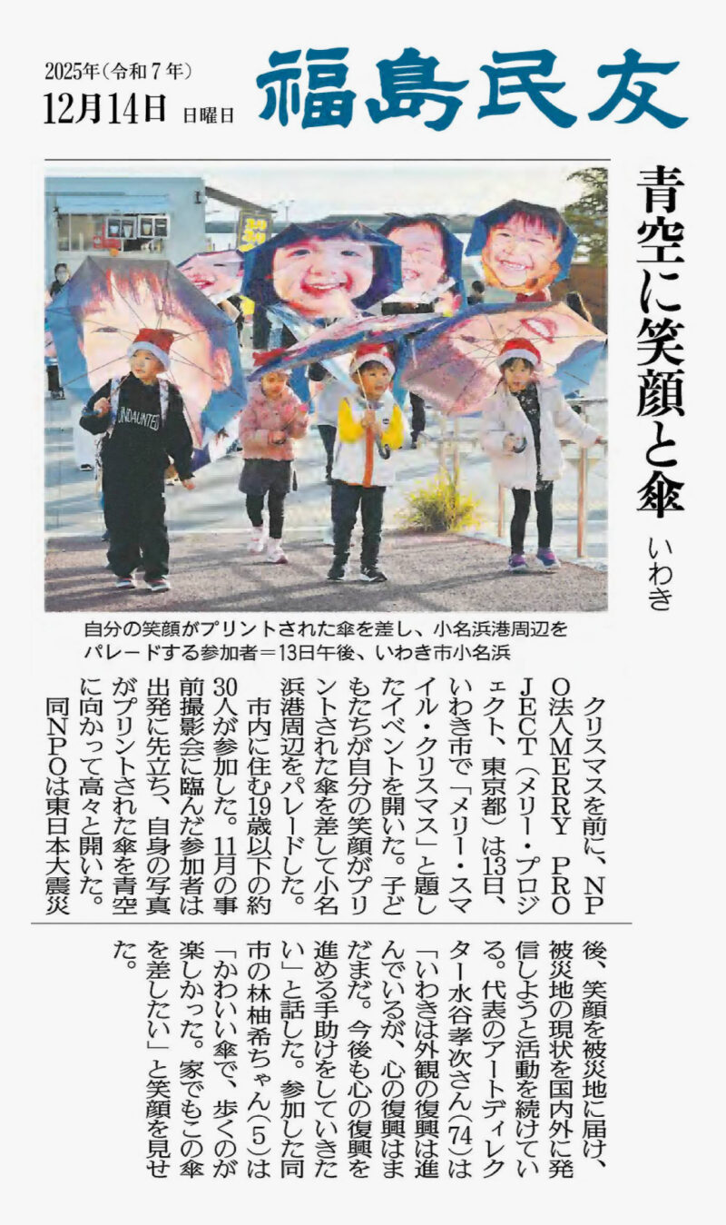 クリスマスを前に、NPO法人MERRY PROJECT(メリー・プロジェクト、東京都)は13日、福島県いわき市で「メリー・スマイル・クリスマス」と題したイベントを開いた。子どもたちが自分の笑顔がプリントされた傘を差して小名浜港周辺をパレードした。